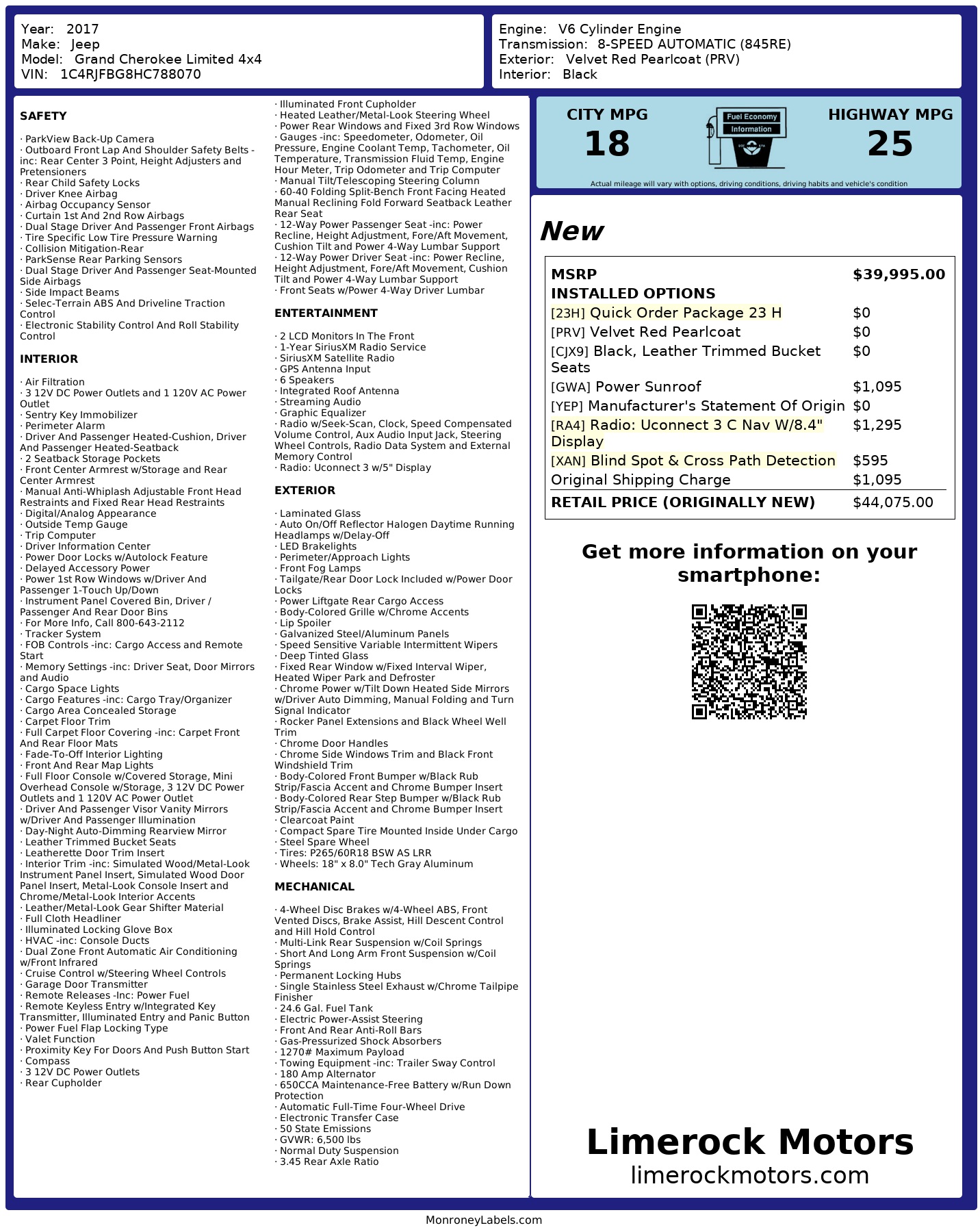 Get ready to turn heads in this fiery red 2017 Jeep Grand Cherokee! This sleek SUV is sure to make a statement with its bold color and rugged yet sophisticated design. With a Carfax report available, you can cruise with confidence knowing this vehicle has been well-maintained and cared for.